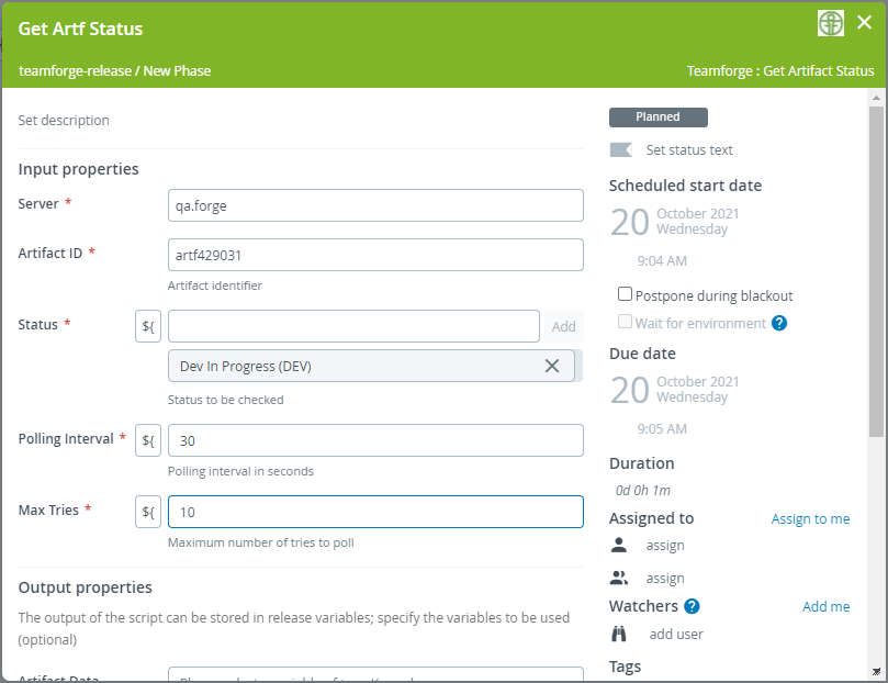 teamforge.GetArtifactStatus: Checks if an artifact is in a particular status, and if so, proceeds to the next release task